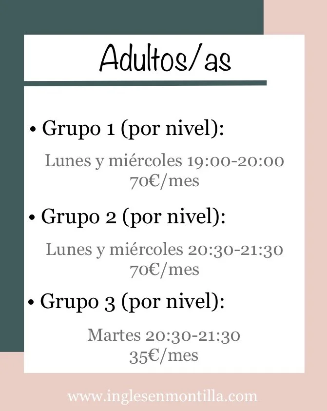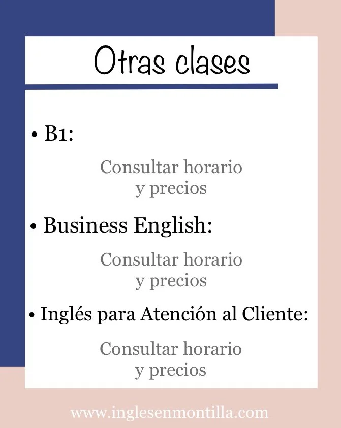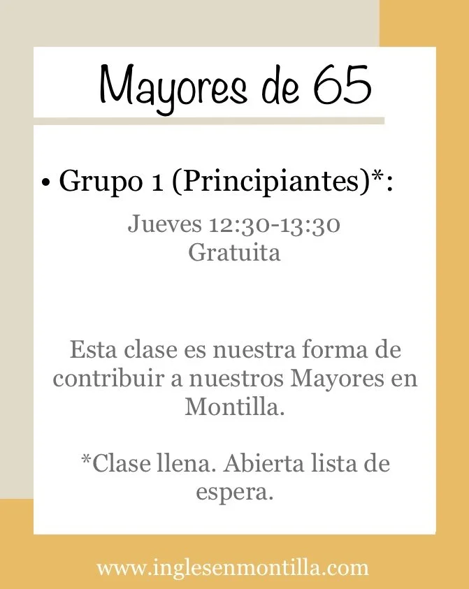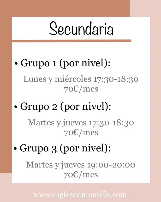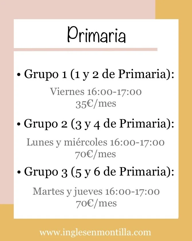 Horarios y Precios (Septiembre)* No hay matrícula.* Hay sólo entre 4 y 6 plazas según la clase.* Las plazas se asignarán respetando el orden de reserva.Para guardar una plaza, escríbenos por WhatsApp aquí. Clases para Primaria Clases para Secundaria Clases para Adultos/as Clases para Mayores de 65 años Otras Clases Cómo guardar plaza